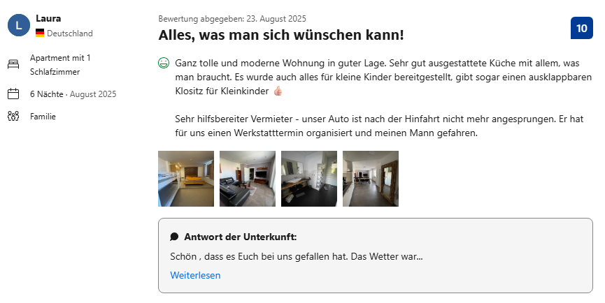 Wenn Sie weitere Fragen zu unserer Ferienwohnung haben, zögern Sie nicht, uns zu kontaktieren! Wir stehen Ihnen gerne zur Verfügung.